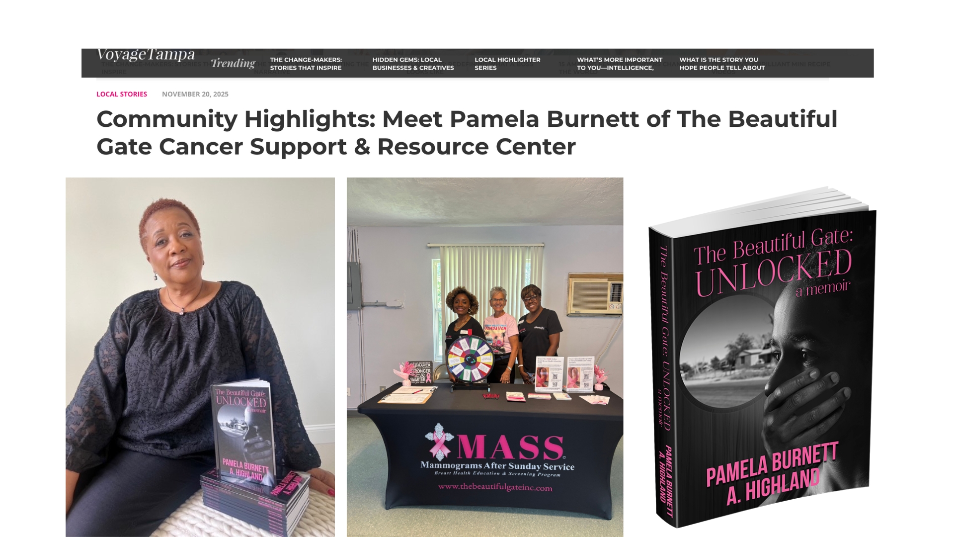 Explore the latest news, media mentions, and press releases featuring The Beautiful Gate Cancer Support & Resource Center and it’s Founder, Pamela Burnett. From our MASS Program Breast Health Education and 3D mammogram screening outreach events to inspiring stories of survivors and advocates, stay informed about how we’re making a difference in Florida and beyond. Discover how we’re working to provide life-saving screenings, resources, and support to uninsured and underinsured women.
